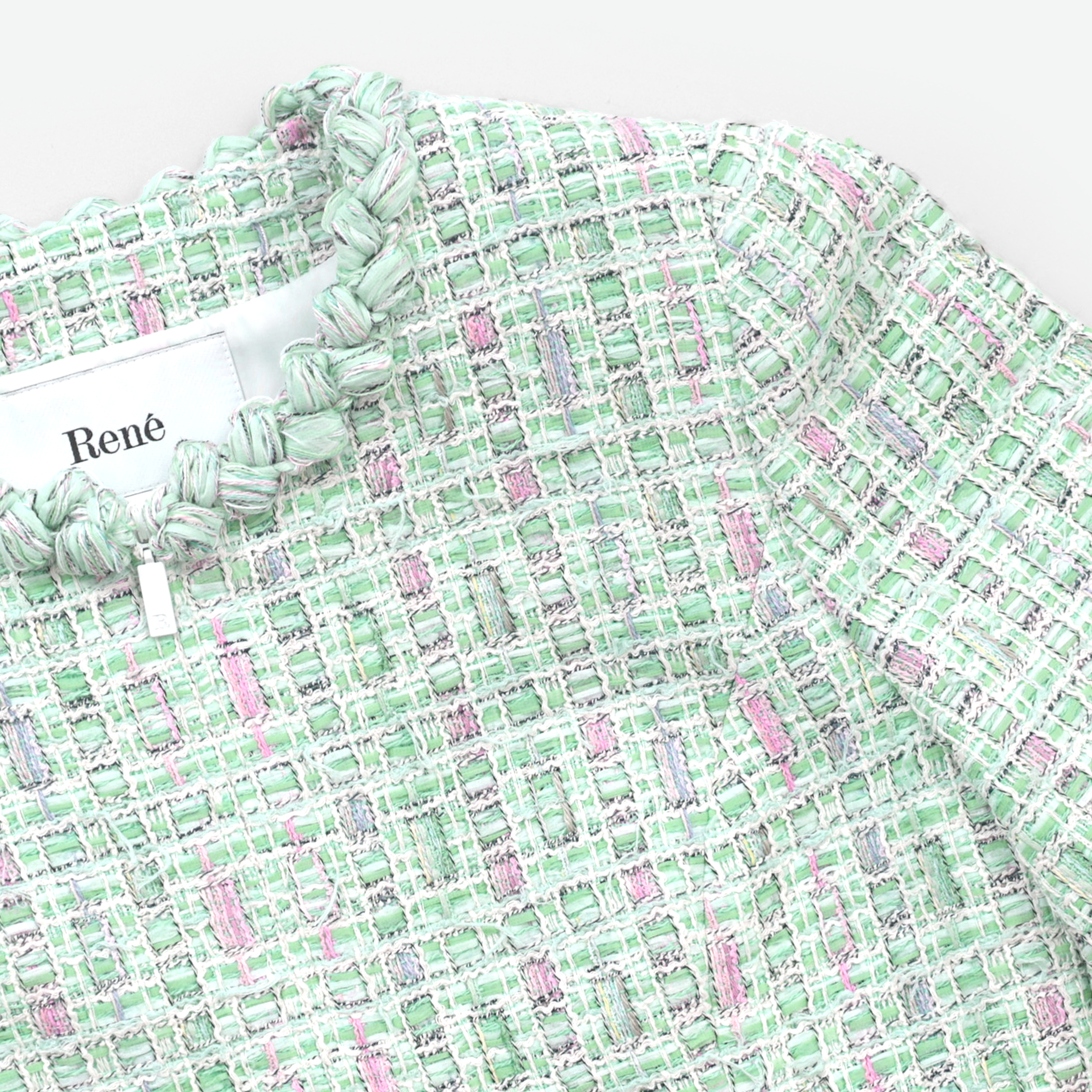 鮮やかなグリーンとピンクのコントラストに心踊る、華やかなマリアツイードジャケット。