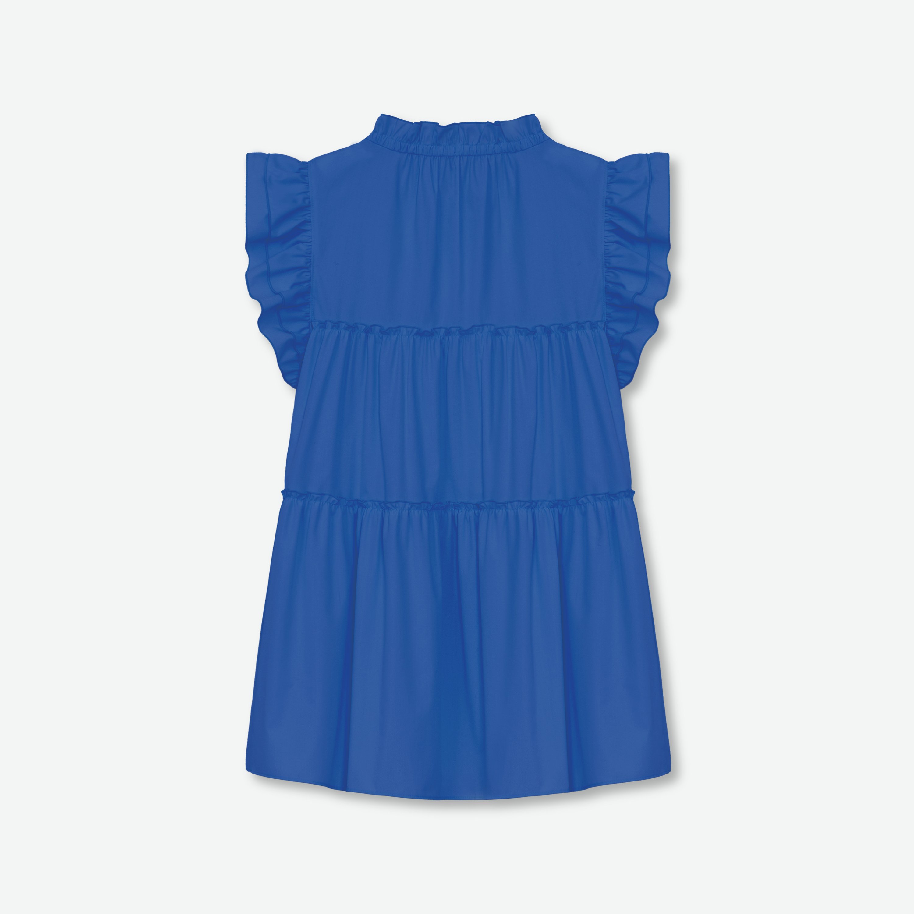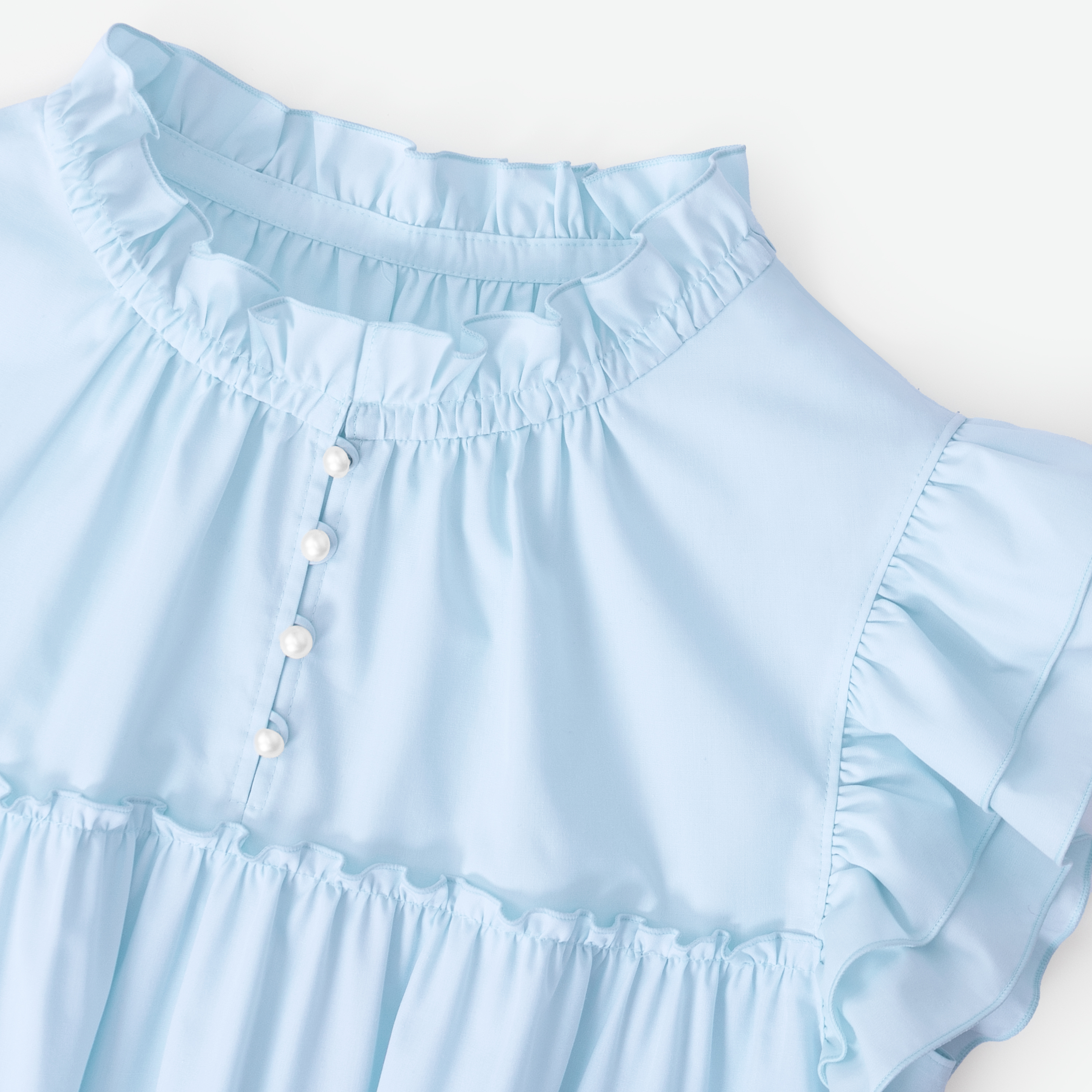 顔まわりを華やかに演出するフリルに、二段ティアードがフェミニンなブラウス。