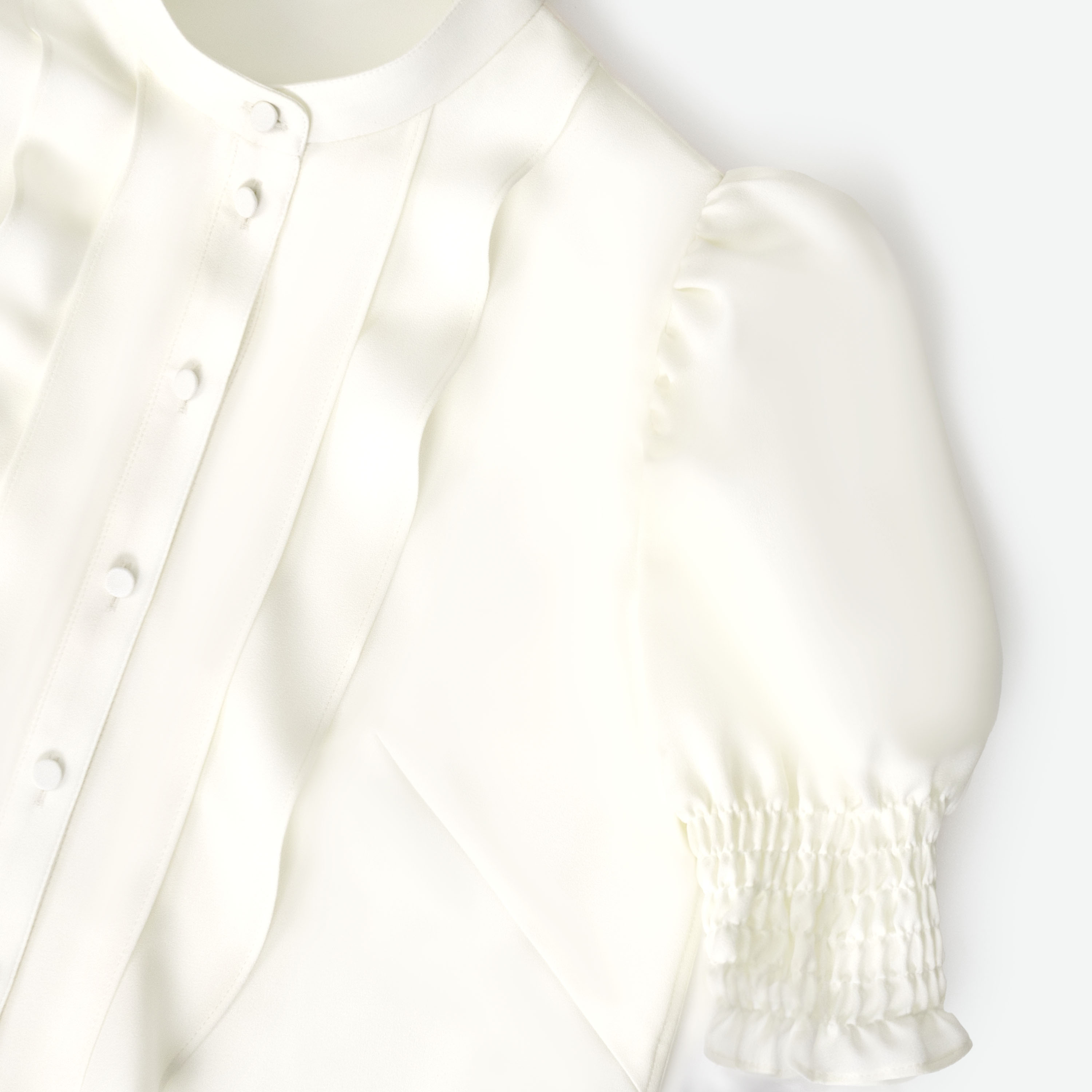 ほどよく立体感のあるパフスリーブと、胸元のフリルがフェミニンなブラウス。